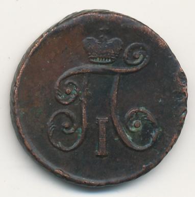 Лицевая сторона — вензель Павла I под короной, оборотная — номинал (1 деньга) и дата. Нормативный вес — 5,12 грамма, гурт — шнур.