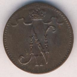 Лицевая сторона — вензель Александра II, оборотная — номинал (1 PENNIA) и дата. Нормативный вес — 1,28 грамма, гурт гладкий.