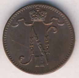 Лицевая сторона — вензель Александра II, оборотная — номинал (1 PENNIA) и дата. Нормативный вес — 1,28 грамма, гурт гладкий.
