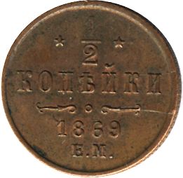 Лицевая сторона — вензель Александра II в венке из лавровой и дубовой ветвей; оборотная — обозначение номинала (1/2 копейки) и дата. Нормативный вес — 1,64 грамма, гурт рубчатый.
