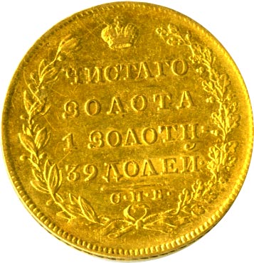 Лицевая сторона - «масонский» орел, дата и надпись «ПЯТЬ РУБЛЕЙ»; оборотная - венок из лавровой и дубовой ветвей вокруг надписи «ЧИСТАГО ЗОЛОТА 1 ЗОЛОТН 39 ДОЛЕЙ». Проба — 917, нормативный вес — 6,54 грамма,