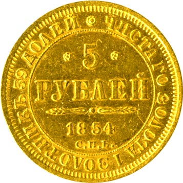 Лицевая сторона — двуглавый орел с местными гербами на крыльях, оборотная — обозначение номинала (5 рублей) и дата в круговой надписи «ЧИСТАГО ЗОЛОТА 1 ЗОЛОТНИКЪ 39 ДОЛЕЙ».