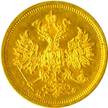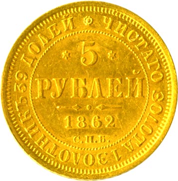 Лицевая сторона — двуглавый орел с восемью местными гербами на крыльях, оборотная — обозначение номинала (5 рублей) и дата в круговой надписи «ЧИСТАГО ЗОЛОТА 1 ЗОЛОТНИКЪ 39 ДОЛЕЙ».