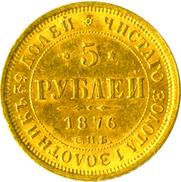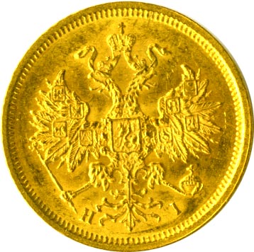Лицевая сторона — двуглавый орел с восемью местными гербами на крыльях, оборотная — обозначение номинала (5 рублей) и дата в круговой надписи «ЧИСТАГО ЗОЛОТА 1 ЗОЛОТНИКЪ 39 ДОЛЕЙ».