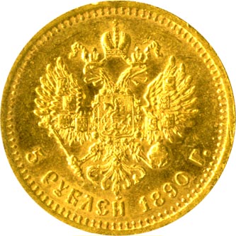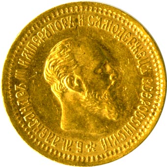 Лицевая сторона — портрет Александра III и надпись «Б.М.АЛЕКСАНДРЪ III ИМПЕРАТОРЪ И САМОДЕРЖЕЦЪ ВСЕРОССIЙСКIЙ»», оборотная — двуглавый орел, обозначение номинала (5 рублей) и дата.