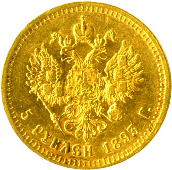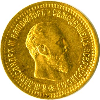 Лицевая сторона — портрет Александра III и надпись «Б.М.АЛЕКСАНДРЪ III ИМПЕРАТОРЪ И САМОДЕРЖЕЦЪ ВСЕРОССIЙСКIЙ»», оборотная — двуглавый орел, обозначение номинала (5 рублей) и дата.