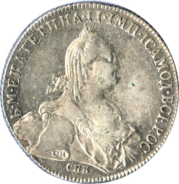 Лицевая сторона — портрет императрицы и надпись «Б М ЕКАТЕРИНА II IМП I САМОД ВСЕРОС», оборотная — двуглавый орел и надпись «МОНЕТА РУБЛЬ» и дата. Проба — 750, нормативный вес — 24 грамма, гурт — шнур.