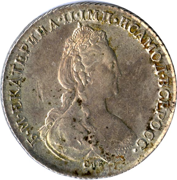 Выделяют два типа - «шея длиннее» и «шея короче». Лицевая сторона — портрет императрицы и надпись «Б М ЕКАТЕРИНА II IМП И САМОД ВСЕРОСС», оборотная — двуглавый орел и надпись «МОНЕТА РУБЛЬ» и дата. Проба — 750, нормативный вес — 24 грамма, гурт — шнур.