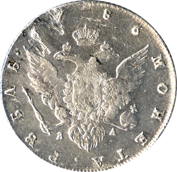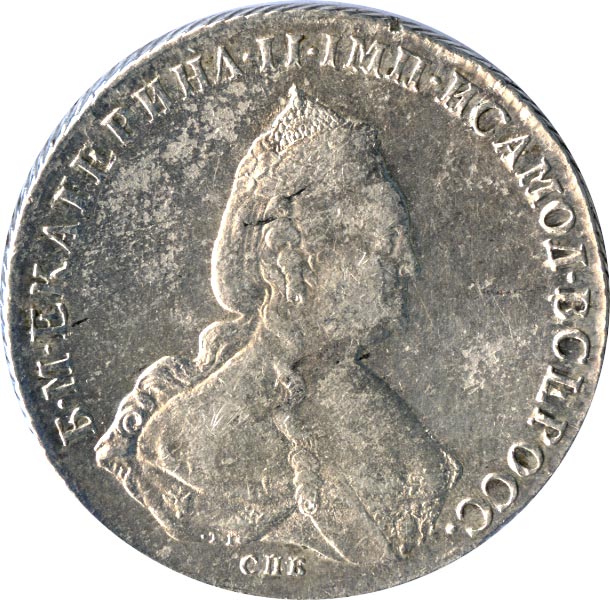 Выделяют два типа - «шея длиннее» и «шея короче». Лицевая сторона — портрет императрицы и надпись «Б М ЕКАТЕРИНА II IМП И САМОД ВСЕРОСС», оборотная — двуглавый орел и надпись «МОНЕТА РУБЛЬ» и дата. Проба — 750, нормативный вес — 24 грамма, гурт — шнур.