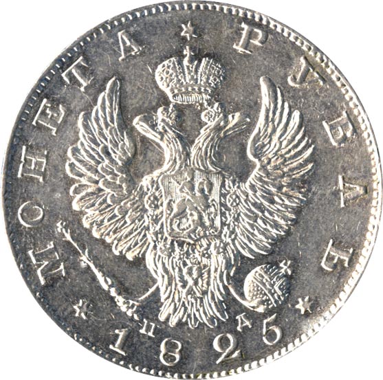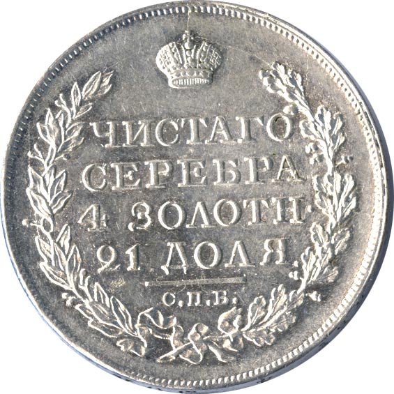 Манифест от 20 июня 1810 года «О новом устройстве монетной системы» устанавливает серебряный рубль законной мерой всех расчетов. Банковые монеты — рубли и полтины — изменяют свой внешний вид. Броская надпись внутри венка на оборотной стороне указывает содержание чистого серебра в монете, а номинал занимает скромное место вокруг орла. Гуртовая надпись сообщает о пробе и лигатурном весе.