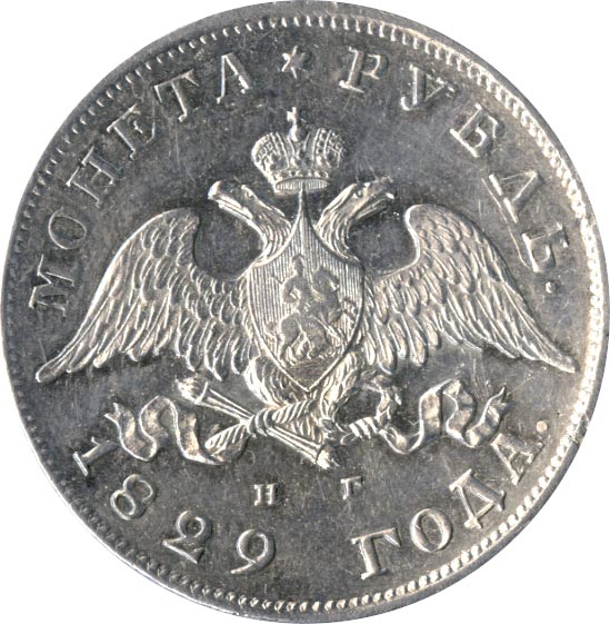 Указом от 1 июля 1826 года Николай I сохраняет вес и пробу золотых и серебряных монет, но приводит к единообразию их внешний вид. На серебряные монеты, вслед за золотыми, помещается новый герб - так называемый «масонский» орел с опущенными крыльями, на груди которого московский герб, в лапах факелы, лавровый венок, ликторский пучок и лента, без корон на головах. См. Статью «Масонский орел» на сайте «Конрос».