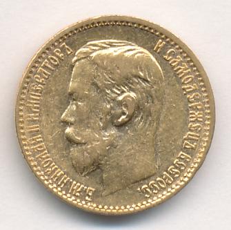 Лицевая сторона — портрет Николая II и надпись «Б.М. НИКОЛАЙ II ИМПЕРАТОРЪ И САМОДЕРЖЕЦЪ ВСЕРОСС»», оборотная — двуглавый орел, обозначение номинала (5 рублей) и дата.