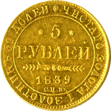 Лицевая сторона — двуглавый орел с местными гербами на крыльях, оборотная — обозначение номинала (5 рублей) и дата в круговой надписи «ЧИСТАГО ЗОЛОТА 1 ЗОЛОТНИКЪ 39 ДОЛЕЙ».