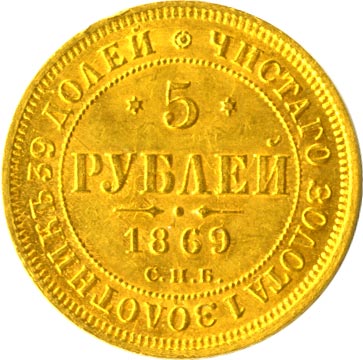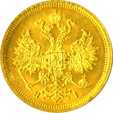 Лицевая сторона — двуглавый орел с восемью местными гербами на крыльях, оборотная — обозначение номинала (5 рублей) и дата в круговой надписи «ЧИСТАГО ЗОЛОТА 1 ЗОЛОТНИКЪ 39 ДОЛЕЙ».