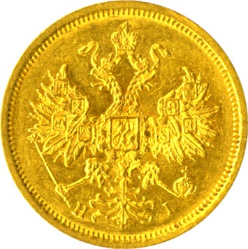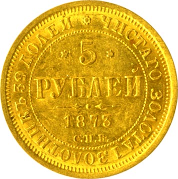 Лицевая сторона — двуглавый орел с восемью местными гербами на крыльях, оборотная — обозначение номинала (5 рублей) и дата в круговой надписи «ЧИСТАГО ЗОЛОТА 1 ЗОЛОТНИКЪ 39 ДОЛЕЙ».