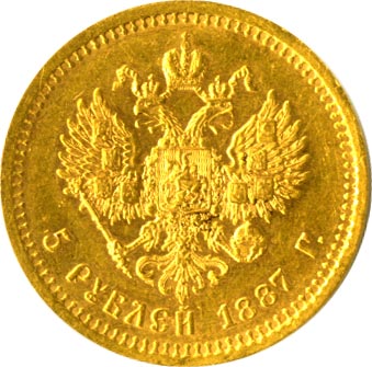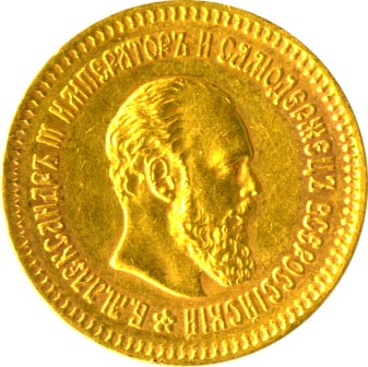 Лицевая сторона — портрет Александра III и надпись «Б.М.АЛЕКСАНДРЪ III ИМПЕРАТОРЪ И САМОДЕРЖЕЦЪ ВСЕРОССIЙСКIЙ»», оборотная — двуглавый орел, обозначение номинала (5 рублей) и дата.