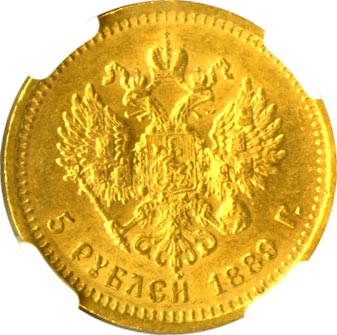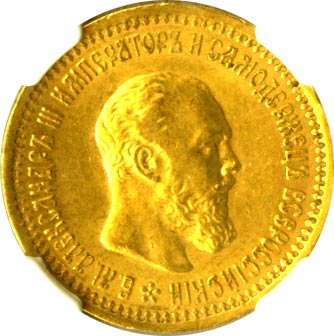 Лицевая сторона — портрет Александра III и надпись «Б.М.АЛЕКСАНДРЪ III ИМПЕРАТОРЪ И САМОДЕРЖЕЦЪ ВСЕРОССIЙСКIЙ»», оборотная — двуглавый орел, обозначение номинала (5 рублей) и дата.