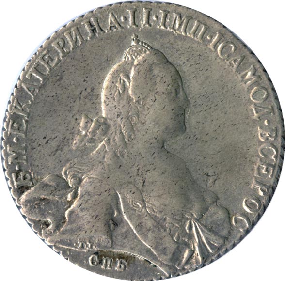 Лицевая сторона — портрет императрицы и надпись «Б М ЕКАТЕРИНА II IМП I САМОД ВСЕРОС», оборотная — двуглавый орел и надпись «МОНЕТА РУБЛЬ» и дата. Проба — 750, нормативный вес — 24 грамма, гурт — шнур.