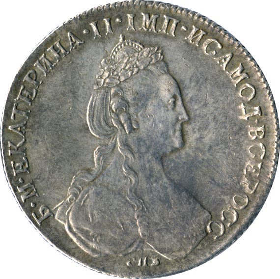 Выделяют два типа - «шея длиннее» и «шея короче». Лицевая сторона — портрет императрицы и надпись «Б М ЕКАТЕРИНА II IМП И САМОД ВСЕРОСС», оборотная — двуглавый орел и надпись «МОНЕТА РУБЛЬ» и дата. Проба — 750, нормативный вес — 24 грамма, гурт — шнур.