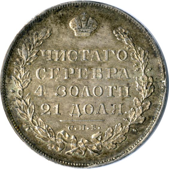 Лицевая сторона - «масонский орел», надпись «МОНЕТА РУБЛЬ» и дата, оборотная - окруженная венком из лавровой и дубовой ветвей надпись «ЧИСТАГО СЕРЕБРА 4 ЗОЛОТН 21 ДОЛЯ». Проба — 868, нормативный вес — 20,73 грамма.