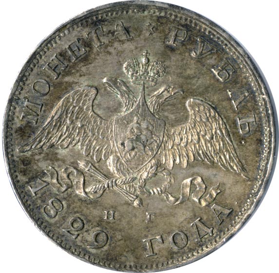 Указом от 1 июля 1826 года Николай I сохраняет вес и пробу золотых и серебряных монет, но приводит к единообразию их внешний вид. На серебряные монеты, вслед за золотыми, помещается новый герб - так называемый «масонский» орел с опущенными крыльями, на груди которого московский герб, в лапах факелы, лавровый венок, ликторский пучок и лента, без корон на головах. См. Статью «Масонский орел» на сайте «Конрос».