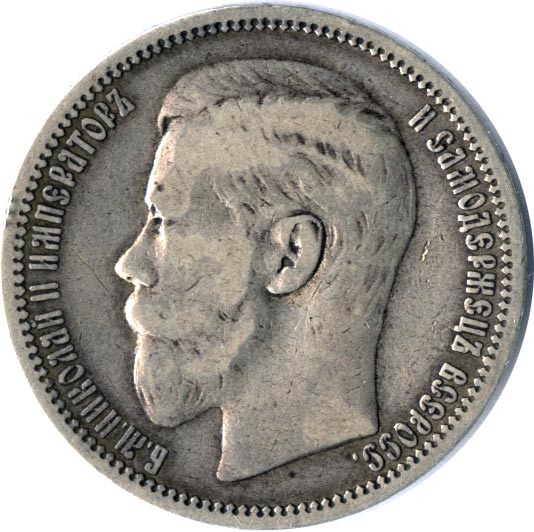 Николай II сохраняет принятый отцом тип, но на банковских монетах его портрет (работы Васютинского) повернут влево (на запад). На оборотной стороне сохраняется тот же герб, вплоть до знака АГ под задней ногой коня.
