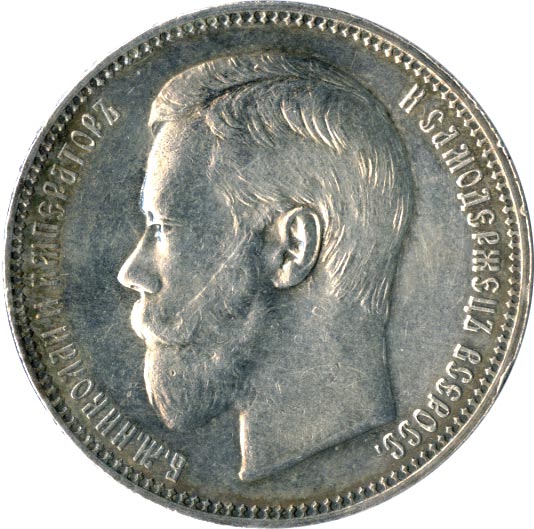 Николай II сохраняет принятый отцом тип, но на банковских монетах его портрет (работы Васютинского) повернут влево (на запад). На оборотной стороне сохраняется тот же герб, вплоть до знака АГ под задней ногой коня.