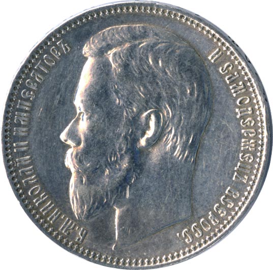 Николай II сохраняет принятый отцом тип, но на банковских монетах его портрет (работы Васютинского) повернут влево (на запад). На оборотной стороне сохраняется тот же герб, вплоть до знака АГ под задней ногой коня.