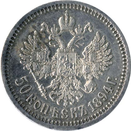 Лицевая сторона — портрет Александра III в круговой надписи «Б.М.АЛЕКСАНДРЪ III ИМПЕРАТОРЪ И САМОДЕРЖЕЦЪ ВСЕРОССIЙСКIЙ», оборотная — двуглавый орел, обозначение номинала (50 копеекъ) и дата.