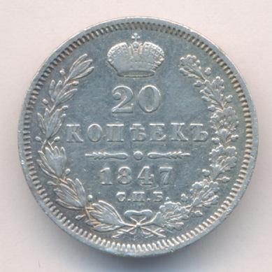 Лицевая сторона — новый гербовый орел с поднятыми крыльями, оборотная —обозначение номинала (20 копеекъ), окруженное венком из лавровой и дубовой ветвей и дата. Проба — 868, нормативный вес — 4,15 грамма.