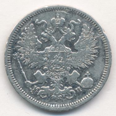 Лицевая сторона — гербовый орел, оборотная —обозначение номинала (20 копеекъ), окруженное венком из лавровой и дубовой ветвей и дата.