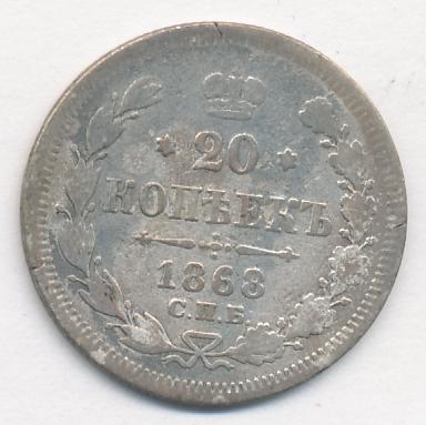 Лицевая сторона — гербовый орел, оборотная —обозначение номинала (20 копеекъ), окруженное венком из лавровой и дубовой ветвей и дата.