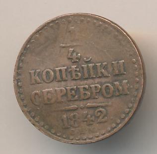 Лицевая сторона — вензель Николая I в бусовом ободке, оборотная — надпись «1/4 КОПЕЙКИ СЕРЕБРОМ» и дата. Нормативный вес — 2,56 грамма, гурт гладкий.