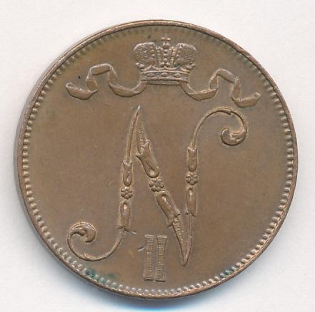 Лицевая сторона — вензель Александра II, оборотная — номинал (5 PENNIA) и дата. Нормативный вес — 6,40 грамма, гурт гладкий.