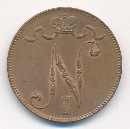 Лицевая сторона — вензель Александра II, оборотная — номинал (5 PENNIA) и дата. Нормативный вес — 6,40 грамма, гурт гладкий.