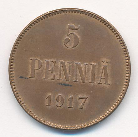 Лицевая сторона — вензель Александра II, оборотная — номинал (5 PENNIA) и дата. Нормативный вес — 6,40 грамма, гурт гладкий.