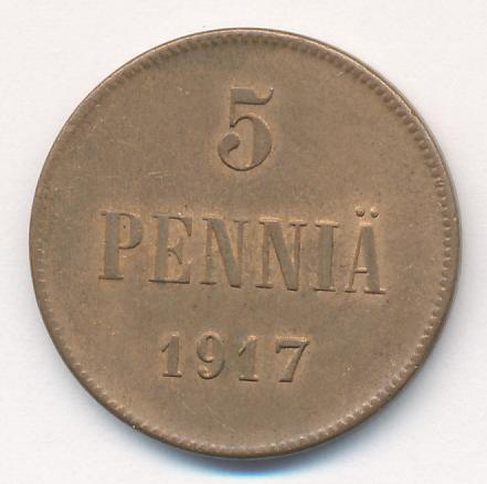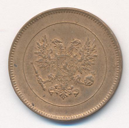 Лицевая сторона — вензель Александра II, оборотная — номинал (5 PENNIA) и дата. Нормативный вес — 6,40 грамма, гурт гладкий.