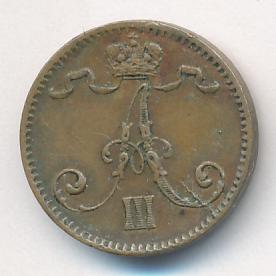 Лицевая сторона — вензель Александра II, оборотная — номинал (1 PENNIA) и дата. Нормативный вес — 1,28 грамма, гурт гладкий.