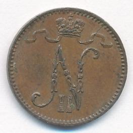 Лицевая сторона — вензель Александра II, оборотная — номинал (1 PENNIA) и дата. Нормативный вес — 1,28 грамма, гурт гладкий.