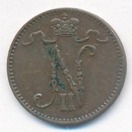 Лицевая сторона — вензель Александра II, оборотная — номинал (1 PENNIA) и дата. Нормативный вес — 1,28 грамма, гурт гладкий.