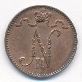 Лицевая сторона — вензель Александра II, оборотная — номинал (1 PENNIA) и дата. Нормативный вес — 1,28 грамма, гурт гладкий.