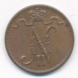 Лицевая сторона — вензель Александра II, оборотная — номинал (1 PENNIA) и дата. Нормативный вес — 1,28 грамма, гурт гладкий.