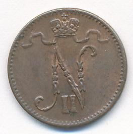 Лицевая сторона — вензель Александра II, оборотная — номинал (1 PENNIA) и дата. Нормативный вес — 1,28 грамма, гурт гладкий.
