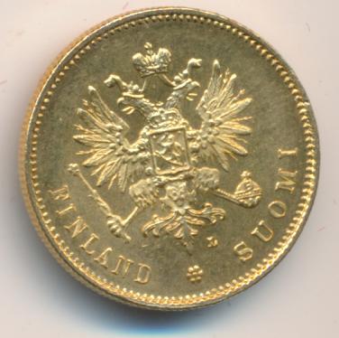 Лицевая сторона — российский двуглавый орел с гербом Великого княжества Финляндского на груди, оборотная — номинал и дата в кольцевой надписи с указанием содержания чистого золота и меди в граммах. Проба — 900, нормативный вес — 6,45 грамма, гурт ребристый.