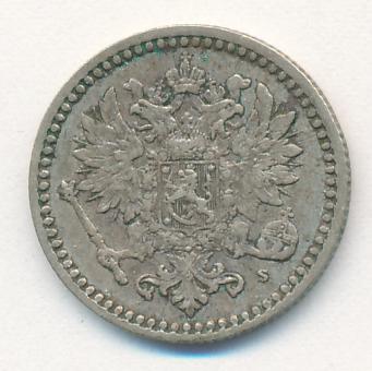 Лицевая сторона — российский двуглавый орел с гербом Великого княжества Финляндского на груди, оборотная — номинал и дата в венке из дубовых листьев. Проба — 750, нормативный вес — 2,55 грамма, гурт рубчатый.