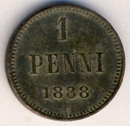 Лицевая сторона — вензель Александра II, оборотная — номинал (1 PENNIA) и дата. Нормативный вес — 1,28 грамма, гурт гладкий.