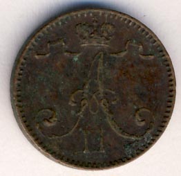 Лицевая сторона — вензель Александра II, оборотная — номинал (1 PENNIA) и дата. Нормативный вес — 1,28 грамма, гурт гладкий.