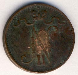 Лицевая сторона — вензель Александра II, оборотная — номинал (1 PENNIA) и дата. Нормативный вес — 1,28 грамма, гурт гладкий.