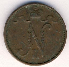 Лицевая сторона — вензель Александра II, оборотная — номинал (1 PENNIA) и дата. Нормативный вес — 1,28 грамма, гурт гладкий.