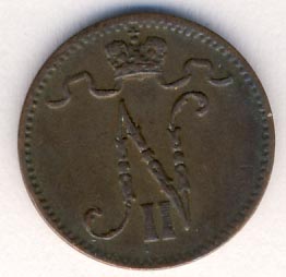 Лицевая сторона — вензель Александра II, оборотная — номинал (1 PENNIA) и дата. Нормативный вес — 1,28 грамма, гурт гладкий.